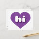Cette carte postale est dotée d'un coeur violet plein de formes et de vitalité, contenant les lettres coques inférieures, blanches et arrondies, hi, une abréviation ludique pour Hawaii, l'état d'aloha. Le verso de la carte postale est vide, en attendant vos sentiments manuscrits ou le texte customisé.