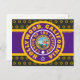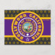 Carte postale noir avec des cercles concentriques violets, dorés et blancs au-dessus d'un rectangle violet et or avec "HOLLYWOOD, CALIFORNIA CENTRE OF THE UNIIVERSE" avec des logos Y-NOT-ME dans l'arrière - plan. Ce design est un cri à Hollywood, la capitale du cinéma de la Californie.
