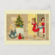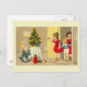 Conçu par Susan Epps Oliver. Image vintage de Noël allemande qui pénètre dans une pièce où un sapin de Noël est entouré de cadeaux et de jouets, y compris un cheval à bascule. Le message est "Herzlichen Weihnachtsgruss".