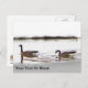 Un jour de printemps gris en Alaska, deux Bernaches du Canada, souvent appelées "klaxons", nagent dans un plan d'eau encore partiellement étouffé par la glace. Customisez en ajoutant votre propre texte. L'oie du Canada, Branta canadensis, a une tête et un cou noirs, des taches blanches sur le visage et un corps gris-brunâtre. La tête et le cou noirs avec "chinstrap" blanc distinguent l'Oie du Canada de toutes les autres espèces d'oies, à l'exception de l'Oie Barnacle, mais celle-ci a une poitrine noire, et aussi un plumage corporel gris, plutôt que brunâtre. L'oie du Canada mesure de 30 à 43 pouces de longueur et a une envergure de 50 à 73 pouces. Les mâles pèsent généralement de 7,1 à 14 livres et peuvent être très agressifs dans la défense du territoire. La femelle a l'air pratiquement identique mais est légèrement plus légère à 5,5-12 livres, et a un klaxon différent. La durée de vie dans la nature des oies qui survivent jusqu'à l'âge adulte varie de 10 à 24 ans Les oies du Canada sont indigènes en Amérique du Nord. Ils se reproduisent au Canada et dans le nord des États-Unis dans une variété d'habitats. Les nids sont généralement situés dans une zone surélevée près de l'eau, comme les cours d'eau, les lacs, les étangs et parfois sur un pavillon de castors. Les oeufs sont pondus dans une dépression peu profonde bordée de matériel plante et de fond. Au cours des dernières années, les populations d'oies du Canada dans certaines régions ont connu une croissance considérable, à tel point que beaucoup les considèrent comme des ravageurs pour leurs dépôts, les bactéries dans leurs dépôts, le bruit et le comportement conflictuel. Ce problème est en partie dû à l'enlèvement des prédateurs naturels et à l'abondance de plans d'eau sûrs et artificiels, comme ceux qui se trouvent sur les terrains de golf, dans les parcs publics et les plages, et dans les collectivités planifiées. En partie à cause de l'accouplement de diverses sous-espèces migratrices avec la sous-espèce giante non migratrice introduite, l'Oie du Canada est souvent une caractéristique de ces environnements urbains qui fait l'objet d'une année entière. Les Bernaches du Canada ont atteint naturellement le nord de l'Europe, comme on l'a démontré par des reprises sonnantes. Les oiseaux sont d'au moins la sous-espèce parvipes, et peut-être d'autres. On trouve aussi des oies du Canada naturellement dans la péninsule du Kamchatka, dans l'est de la Sibérie, dans l'est de la Chine et dans tout le Japon. Comme la plupart des oies, l'oie du Canada est migratrice, l'aire d'hivernage étant la plus grande partie des États-Unis. Les chevaliers de grands groupes de Bernaches du Canada qui volent en formation V signalent les transitions vers le printemps et l'automne. Dans certaines régions, les routes de migration ont changé en raison des changements dans l'habitat et les sources de nourriture. Dans les climats tempérés, de la Californie aux Grands Lacs, une partie de la population est devenue non migratrice en raison d'un approvisionnement alimentaire hivernal adéquat et d'un manque d'anciens prédateurs. Les oies du Canada sont principalement des herbivores, même si elles mangent parfois de petits insectes et des poissons. Leur régime alimentaire comprend la végétation verte et les grains. L'Oie du Canada mange une variété d'herbes sur terre. Il se nourrit en saisissant une lame d'herbe avec la facture, puis en la déchirant d'un bémol de la tête. L'Oie du Canada mange aussi des grains comme le blé, les haricots, le riz et le maïs lorsqu'ils sont disponibles. Dans l'eau, il se nourrit de limon au fond du plan d'eau. Il se nourrit également de plantes aquatiques, comme les algues. Dans les villes, on sait qu'ils ramassent de la nourriture dans les poubelles. On voit souvent des oies adultes diriger leurs oisons dans une ligne, généralement avec un parent à l'avant, et l'autre à l'arrière. Tout en protégeant leurs oisons, les parents chassent souvent violemment les créatures voisines, des petits oiseaux noirs aux humains solitaires qui s'approchent, après les avertir en donnant un bruit de baisers et attaqueront ensuite avec des piqûres et des claques d'ailes si la menace ne se retire pas ou n'a pas saisi un gosling. La plupart des espèces qui se prélèvent sur les oeufs prendront aussi un gosling. Bien que les parents soient hostiles aux oies inconnues, ils peuvent former des groupes de nombreux oisons et quelques adultes, appelés crèches.