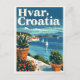 Une description captivante et nostalgique de Hvar, Croatie, connue pour son magnifique littoral adriatique, sa vie nocturne animée et son charme historique. Le design capte les eaux turquoise cristallines de l'île, le port pittoresque et les anciens bâtiments en pierre nichés le long du littoral. Rendu dans un style vintage, l'oeuvre évoque la beauté sereine et l'atmosphère animée de Hvar, invitant les spectateurs à explorer ses paysages enchanteurs et son riche patrimoine culturel.