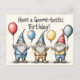 Célébrez dans le style avec cette illustration charmante mettant en vedette trois gnomes joyeux tenant des ballons colorés en rouge, bleu et jaune. Le design ludique comprend le texte amusant 'Joyeux anniversaire gnome-tastique !' dans une police fantaisiste dessinée à la main sur un fond crème doux.