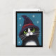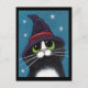 Carte postale du chat Halloween illustrant l'illustration excentrique d'un chat en smoking portant le casquette d'une sorcière. Oeuvre © Lisa Marie Robinson. Tous droits réservés.