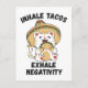 Joli design qui montre un chaton caricaturiste adorable portant un casquette sombrero et mangeant un taco mexicain avec la citation amusante "tacos inhale, exhale négativité. Une cuisine savoureuse vous rend heureux.
