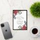 L'élégante invitation à la fête de Noël présente deux ressorts fleuris qui ornent un cadre en feuille d'or. Les sources ont des roses rouges, des fleurs de coton blanc, des sucres de canne, des pins et des verdure sainte. Le dos de la carte postale vous donne suffisamment de place pour envoyer des salutations de vacances et toutes les instructions pour votre fête de Noël.