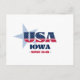 Carte postale Iowa. Un design de typographie créatif qui résume l'essence de l'Iowa avec des couleurs audacieuses, rouge, blanc et bleu, et des éléments patriotiques, dont des étoiles et des rayures.