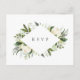 Notre collection de mariages floraux à l'aquarelle d'ivoire présente une verdure d'aquarelle délicatement peinte, un feuillage botanique vert et des fleurs de pivoines blanches et d'ivoire. Personnalisez cette carte postale RSVP correspondant à votre date de réponse et à vos choix de repas ou de plats.