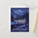 Capture the cozy serenity of Jackson Hole, Wyoming, USA, with this breathtaking vintage-style postcard featuring a winter night scene. The design showcases a small village of illuminated log cabins nestled beside a reflective river, surrounded by snow-covered pine trees and dramatic, moonlit mountains. This travel poster is perfect for skiers, winter sports enthusiasts, nature lovers, and anyone who appreciates rustic mountain scenery. Ideal for sending holiday greetings, keeping as a cozy souvenir, or framing as rustic lodge decor.