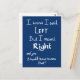 Cette carte postale bleue hilarante est un cadeau parfait pour papa, petit ami ou amis qui ne peuvent pas résister à un bon débat sur les directions! Avec le slogan plein d'esprit, "Je sais que j'ai dit GAUCHE, mais je voulais dire "C'était bien et vous auriez dû le savoir !" cette carte postale amusante capture la frustration humoristique de se perdre dans un désaccord au volant. C’est l’idéal pour ceux qui ne peuvent s’empêcher d’avoir raison, même s’ils ne le sont pas clairement. Une plaisanterie amusante et gaie, cette carte postale d'argument de conduite bleue ne manquera pas de la faire rire. Créé par The Sweetmans, c’est un accueil parfait et léger à partager avec les êtres chers aux défis directionnels de votre vie!
