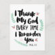 Calligraphie moderne Design typographie art en noir avec des mots : "Je remercie Dieu chaque fois que je me souviens de toi." Le design est agrémenté de fleurs et de lauriers colorés. L'Écriture biblique est de Phillippiens 1:3.