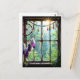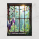 Une belle carte postale pour dire bonjour et rester en contact avec un ami ou un membre de la famille. Une fenêtre rustique avec un attrape-rêve à plumes violettes suspendu dans la fenêtre ainsi que des cristaux scintillants colorés. La fenêtre donne sur un beau paysage d'arbres et de rayons de soleil qui brillent à travers.