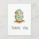 Jolie carte de remerciement verte et neutre en genre avec un petit oiseau qui sort de son œuf. Idéal pour les fêtes de naissance et les premiers anniversaires. Illustré et conçu par Patricia Alvarez.