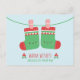 Une mignonne paire de chaussettes d'hiver en vert et rouge sont accrochées sur une ligne verte avec des pieux roses. Le texte correspondant dit "Chaleureux Voeux !" qui est parfait pour les vacances de Noël ! Décoré avec un faux orteil.