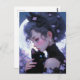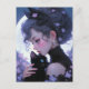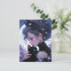 Cette belle dame s'accroche avec amour son chaton noir mignon près de son coeur. Derrière eux, la pleine lune brille dans le ciel nocturne, donnant à la scène une sensation magique et capricieuse. De jolies fleurs violettes les entourent. La carte parfaite à envoyer à n'importe quel amoureux des chats !