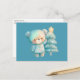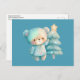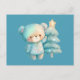 Carte postale avec une adorable illustration. Un ours douillet aux étoiles et aux étincelles dans sa fourrure. À côté d'un sapin de Noël. Couleur pastel bleu-vert. Whimsical et mignon.