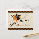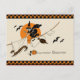 Une illustration vintage, mignonne, noire, blanche et orange, d'une petite sorcière ancienne, chevauchant son balai, sur une ligne de vêtements avec serviettes et couvertures suspendues. La sorcière traverse une lune vive, orange, pleine, avec un groupe de chauves-souris noires. Sur l'illustration, il est écrit, "Salutations d'Halloween", à côté d'un petit citrouille. La sorcière a des cheveux blancs, un casquette pointu noir, et une robe noire avec un col blanc dessus. Très capricieux et adorable. Idéal pour les amateurs d'Halloween, d'art vintage, de citrouilles et de sorcières. Regardez ma boutique, SpookyGhost, pour des cadeaux Halloween plus vintages.