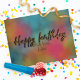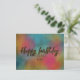 Design moderne et tendance de carte postale d'anniversaire personnalisée avec le texte "Joyeux anniversaire" écrit en écriture pailletée or faux sur un fond aquarelle coloré.