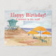 Joyeux anniversaire - célébrer dans le sable - salutations inspirées par Huntington Beach où les cabanes de sauveteurs sont bleu clair et les parapluies décorent le littoral à perte de vue le long de la côte californienne peint à la main en plein air avec de l'aquarelle.