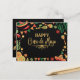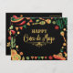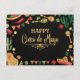 Cette carte postale est une invitation captivante aux célébrations du Cinco de Mayo, conçues avec un air festif. L'arrière - plan noir et riche met la scène, offrant un contraste spectaculaire qui fait éclater chaque élément du design avec la vitalité. L'accueil central, "HAPPY Cinco de Mayo", est élégamment scénarisé dans une police dorée radieuse, qui apporte une touche luxueuse à la fête traditionnelle. Bordant le haut et le bas de la carte sont des illustrations ludiques qui encapsulent l'esprit de la fête. Il s'agit de sombreros colorés aux broderies complexes, de maracas animées, de cactus verts en spirale et de piments rouges gras, tous confectionnés dans un détail charmant. Les illustrations sont placées au milieu d'une série de motifs lumineux et décoratifs, dont des fleurs et des formes abstraites, qui donnent un clin d'oeil à l'artisanat et à la beauté naturelle qui sont synonymes de la culture mexicaine. Un dainty string de papel picado, les décorations traditionnelles mexicaines de papier coupé, ajoute une bordure délicieuse le long du fond, contribuant au thème général de la célébration avec son éventail de drapeaux rouges, jaunes et verts. Compléter le design sont de petites orbes brillantes qui ajoutent une touche de fantaisie, comme si imitant l'étincelle des lumières festives. Cette carte postale allie les éléments classiques du Cinco de Mayo à une sensibilité design moderne, ce qui en fait un morceau idéal pour envoyer des salutations festives ou inviter des amis et la famille à une célébration du Cinco de Mayo.