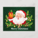 Illustration d'un Père Noël souriant tenant un cadeau, entouré de décorations de Noël, contre un arrière - plan vert foncé avec des points blancs ressemblant à de la neige. Père Noël a une barbe blanche et des joues roses, portant un casquette rouge et un manteau avec garniture blanche. Le cadeau est emballé dans du papier or avec un arc rouge. Les décorations comprennent des branches de pin vert, des sucres de canne et de petits ornements dorés. Le texte "Joyeux Noël" est écrit en blanc en bas. Le style est caricatural avec des couleurs vives et joyeuses.