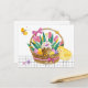 Une carte de voeux de Pâques mignonne et festive avec un panier de Pâques rempli de tulipes, oeufs peints et un adorable poussin !