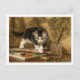 Carte postale d'art avec la peinture du mouvement romantique, The Young Artist de l'artiste hollandaise Henriëtte Ronner-Knip (1821-1909). Un chaton tigre noir et blanc jouant avec des fournitures d'art sur une table.