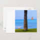 Photo d'un Waikiki, scène de la côte d'Hawaii d'un oiseau (dans la plupart des photos) marchant à gauche, un tronc d'un palmier dressé sur la rive herbeuse. Un voilier aux voiles rayées rouges et jaunes naviguant dans l'océan Pacifique bleu vagues au large de Waikiki, Hawaii. Quelques nuages blancs dans l'arrière - plan tropical. Photo numérique.