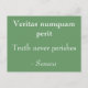 Une carte postale verte à la menthe foncée avec une phrase latine et la traduction anglaise. "La vérité ne périt jamais" est une citation de Seneca, un écrivain romain.