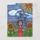 Image de mon dessin original au crayon couleur. Cette peinture d'art populaire a une femme habillée en rouge debout à côté de deux grands tournesols jaunes. Le soleil est au-dessus, souriant. Deux nuages surréalistes flottent au-dessus de son coeur rouge qui souffle sur le sol. Voir mon magasin Art by MAR pour apparier les produits avec ce design.