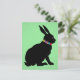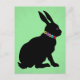 Cette carte postale a un lapin de Pâques ou Printemps assis en silhouette noire avec une couronne de jolies fleurs colorées autour du cou et un oeil rose sur un arrière - plan vert clair.