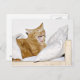 Chat tabby orange se réveillant avec un gros bâton dans une vraie carte postale photo de lit