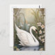 L'image montre un cygne blanc nageant dans un étang entouré de fleurs et d'autres plantes. Le cygne a une expression sereine sur son visage et ses ailes sont étalées comme s'il volait. L'arrière - plan comprend des motifs et des couleurs complexes. L'ambiance générale de l'image est calme et sereine.