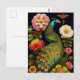 Carte postale avec un paon coloré et une variété de fleurs enchantées. Peinture numérique botanique dans un style Haeckel moderne.