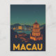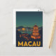 Cette carte captivante présente une illustration de style vintage de l'horizon de Macau la nuit. Le design contraste magnifiquement l'architecture traditionnelle et éclatante au premier plan avec les gratte-ciel modernes et illuminés de la ville derrière. Le ciel bleu foncé, parsemé d'étoiles, ajoute une qualité sereine et intemporelle, ce qui en fait un parfait souvenir ou un accueil pour tous ceux qui aiment voyager et la culture asiatique.