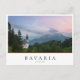 Photo carte postale de nuages colorés dans le ciel pendant le coucher du soleil sur l'église Maria Gern avec une vue vers la grande montagne Watzmann dans les Alpes allemandes près de la frontière avec l'Autriche à Berchtesgaden en Bavière, Allemagne avec un bord blanc et dans une boîte blanche le texte 'Bavière, Allemagne'. La carte a des rayures en noir, rouge et jaune, les couleurs du drapeau allemand.