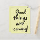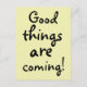 C'est une jolie carte postale inspirante couleur crème qui dit "Les bonnes choses arrivent !" imprimé en lettres cursives mignonnes. Le dos dit 'Voir l'autre côté' Parfait pour encourager quelqu'un à traverser une phase difficile.