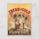 Publicité vintage d'une scène au pôle Nord où les ours polaires dégustent des tasses de bière brune, avec un effet trompe-l'oeil montrant des gens surchauffés, des ventilateurs et des parasols, et un homme qui arrive sur la scène pour une tasse fraîche et froide gelée de bière brune offerte par un ours polaire.