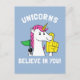 "Unicorns Believe In You", image de licorne dessinée par bCreative montre une licorne aux cheveux roses avec un drapeau et un doigt en mousse pour vous encourager ! Cela fait un grand cadeau pour la famille, les amis ou un régal pour vous-même! Ce graphisme amusant est un grand ajout au style de n'importe qui. bCreative est un créateur et un donneur de licence de design et de propriétés originales et tendance. ©LCT Creative. Licence de bCreative.com