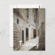 Carte postale de linge constitué de couvertures blanches suspendues pour sécher au soleil sur la façade d'une maison en pierre blanche dans une ruelle avec des escaliers en grès dans une ville en Italie, créant une vue de rue typiquement italienne/méditerranéenne avec le texte 'Toscane'.