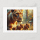 Une lionne majestueuse marche protectivement avec ses deux petits à travers une forêt ensoleillée. Les tons dorés et la lumière tamisée créent une atmosphère chaleureuse et sereine.