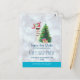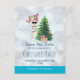 Enregistrez la carte postale de la fête de Noël de la date. Une drôle d'illustration. Un mignon lama portant des lunettes de soleil noires et un chapeau de santa rouge. Derrière un sapin de Noël avec des cadeaux festifs. Le mot Joy écrit au-dessus de sa tête dans une police de vacances colorée. Arrière - plan de bokeh en argent avec une bordure bleue glacée. Design fantasque et amusant à thème de Noël.