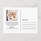 Un modèle de carte postale classique de mariage merci contient une photo à l'avant et à l'arrière, "Amour et Merci" dans une jolie police de caractères manuscrite en noir, et un texte personnalisé, un message de remerciement qui peut être personnalisé. L'arrière - plan blanc au dos de la carte peut être customisé à une autre couleur via Customiser / Edit / Arrière - plan. *Conseil photo : pour vous assurer que vos photos téléchargées sont centrées, recadrez-les avant de les télécharger. Utilisez une taille de 4,25 po x 5,6 po pour la photo avant, et une taille de 2 po x 2 po carré pour la photo arrière. Cela permettra aux photos de remplir parfaitement l'espace lorsque vous "changez" les photos par défaut pour télécharger les vôtres.