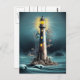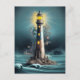 Un phare solitaire illumine un affleurement rocheux tandis que des vagues se jettent à sa base, créant une atmosphère de nuit sereine.