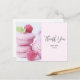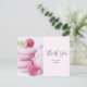 Carte de remerciement avec une délicieuse photographie représentant une tour de macarons roses avec des framboises disposées autour. Délicieusement divin.