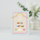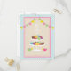 Une invitation à la carte postale d'anniversaire avec l'illustration d'un macaron français et de deux tasses de thé au citron. Bouton au sommet. L'Arrière - plan est en vichy bleu. Personnalisez tout le texte.