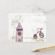 Carte postale des maisons cassées par l'artiste John Allen. la maison est colorée à l'extérieur mais en dessous se trouve un fil bardé avec une fleur de dos et tricycle vide.