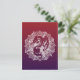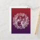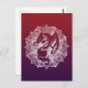 un design de mandala décoratif avec beaucoup d'éléments géométriques ornementaux et la silhouette ou l'ombre d'un dragon mythique ou d'un lézard sur une carte postale rouge à violet.