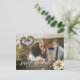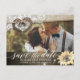 Modèles de Cartes Postales pour Mariage de Style Campagnard Rustique Enregistrer la Date PHOTO - Couple Ancien Fer à Cheval Cœur avec Nœud de Corde et Dentelle Blanche, Tournesol, Guirlande Lumineuse et Tissu Burlap sur Fond de Bois de Grange Vieille.