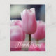 Cette carte postale Merci a une photo couleur de quelques tulipes roses sur le devant, avec une fleur unique en surbrillance. En bas, il y a une bande rose douce avec du Merci écrit en blanc. Au dos, il est vide pour que vous puissiez écrire votre message de remerciement à la maison. Cela fonctionnerait bien pour un carte de remerciements Mariage du printemps ou de l'été.