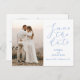 Une belle carte postale enregistrer la date avec votre photo verticale sur le plateau avant à côté de l'élégant script "Enregistrer la date" lettrage à la main dans un joli bleu clair. Ajoutez vos noms, votre date et votre emplacement pour personnaliser. L'arrière de l'hôtel comporte tous vos détails personnalisés. Simple, classique, élégant avec un minimum de modernité - il s'harmonise parfaitement avec tant de styles/thèmes mariages d'aujourd'hui.